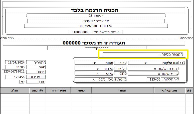 בשלב זה אנו יכולים להתחיל להוציא חשבוניות, ומספר ההקצאה אמור להופיע על גבי התדפיס, במקום שהגדרנו אותו