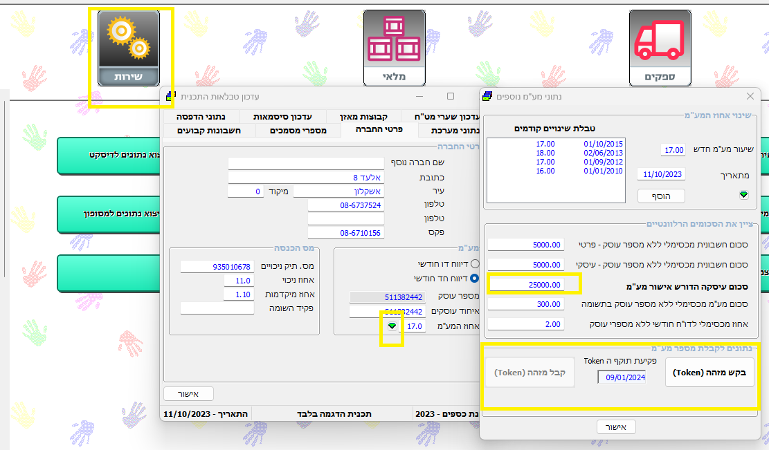 השלב הבא אותו עלינו לעשות הוא להיכנס לתוכניות שירות, עדכון טבלאות התכנית, וללחוץ על החץ הירוק ליד אחוז המע"מ נקבל את המסך הבא: