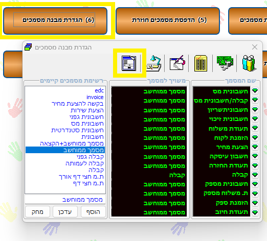 במסך קיימים 3 טורים, הטור הימני מראה את סוגי המסמכים שהתוכנה מפיקה, הטור השמאלי מראה את מבני (תיכנון) המסמכים הקיימים. ואילו הטור האמצעי מראה אילו מבני מסמכים משוייכים לאילו מסמכים. במקרה שלפנינו כל המסמכים פרט לקבל משוייכים למבנה "מסמך ממוחשב". עלינו לסמן בטור השמאלי את המסמך אותו אנו רוצים לעדכן, ואז ללחוץ על הכפתור השמאלי בסרגל (המסומן בצהוב). התוכנה תבקש סיסמה. אין צורך להקליד סיסמה אלא פשוט ללחוץ על כפתור אישור. בשלב זה נקבל את המסך הבא (או דומה לו), בתמונה מוצג רק החלק העליון של המסך